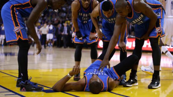 Seconds before halftime, Durant stepped on Marreese Speights' foot and badly rolled his ankle while going hard to the basket. Durant was called for a charge on the play. He stayed on the floor as teammates huddled around him before limping off with some assistance.