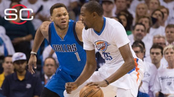 According to ESPN Stats & Information, 22 of Durant's shots were contested, 18 came outside the paint and eight were in the fourth quarter, including three in the final 24 seconds. Durant shot only five free throws (and made all five), which was a source of frustration for the team.