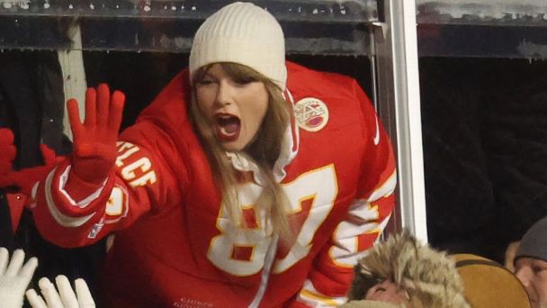 Kristin Juszczyk, wife of 49ers fullback Kyle Juszczyk, helped Taylor Swift take on Kansas City's bitter cold with a custom puffer coat made of Travis Kelce's jersey.