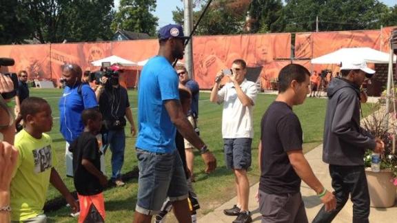James strolled into the locker room after practice, saying "I'll see y'all tomorrow" as he walked -- a reference to Friday's welcome-home party at the University of Akron's football stadium, a short drive from his present and childhood homes. He greeted players inside, then spent time chatting with Johnny Manziel on the field.
