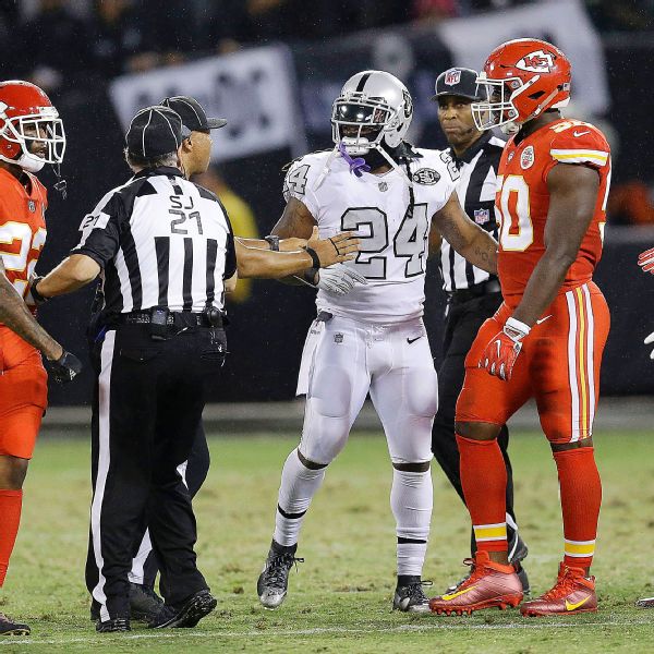 Lynch, an Oakland Raiders running back, ran off the sideline and into a scrum after Peters hit Raiders quarterback Derek Carr late, drawing a flag for a personal foul. Several Raiders offensive linemen went after Peters, an Oakland native and close friend of Lynch's. Lynch bumped line judge Julian Mapp in the chest and then grabbed the official by the jersey before letting go and tending to Peters.