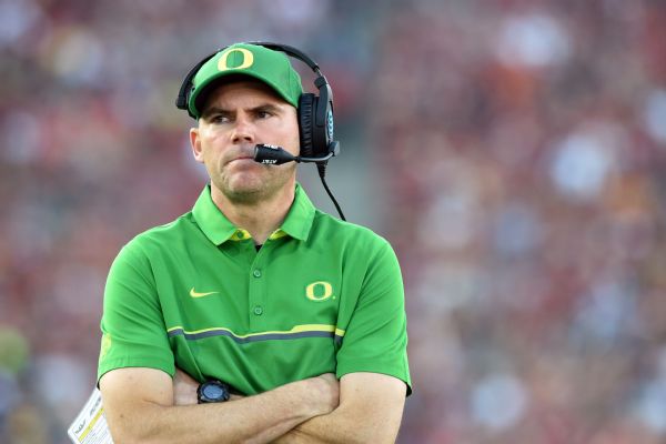 Among the notes about Helfrich that the release cited, it said the Ducks "had to rely on graduate transfers" to play quarterback entering the 2015 and 2016 seasons and pointed out how the Ducks "went for two after all five of their touchdowns and converted once" in their 35-32 loss to Nebraska on Sept. 17.