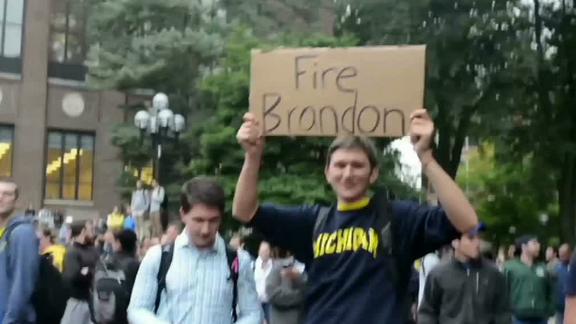 The incident, coupled with a 2-3 record on the field and some of Brandon's previous changes to the program, caused frustration to boil over in Ann Arbor this week. Hundreds of students and fans marched to the president's house on Michigan's campus Tuesday night to ask that Brandon be fired.