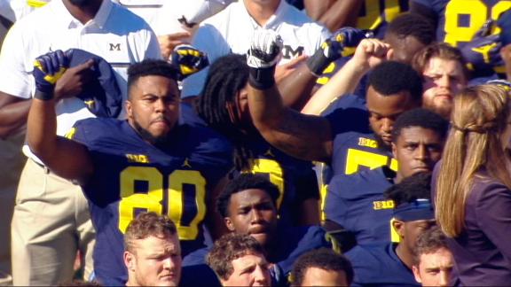 Later on Saturday, Michigan players held their right fists in the air on their home sideline while the national anthem played at the Big House.