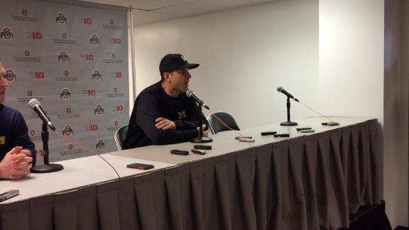 COLUMBUS, Ohio -- Michigan coach Jim Harbaugh strongly criticized Big Ten officials for several calls during Saturday's 30-27 loss to Ohio State, including a spot that gave the Buckeyes a first down in the second overtime.