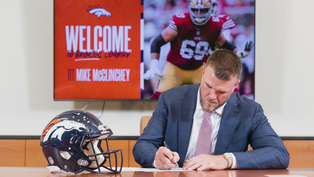 SANTA CLARA, Calif. -- After spending his first five NFL seasons with the San Francisco 49ers, offensive tackleMike McGlincheybecame a free agent for the first time March 13.