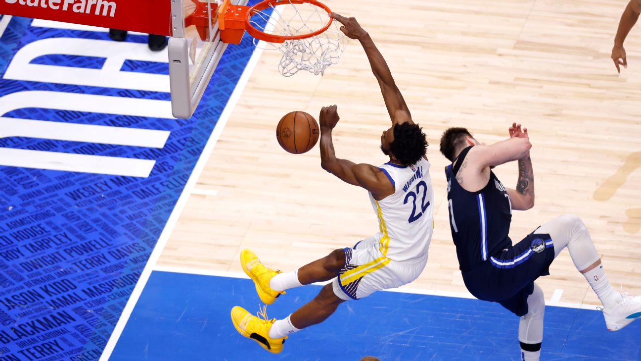 More specifically, Wiggins' preposterous dunk overLuka Doncic. Wiggins, who scored a playoff career-high27 points, took flight over Doncic midway through the fourth quarter for what was originallyruled an offensive foul. Golden State challenged, and the ruling was Wiggins' elbow to Doncic was incidental contact, giving the Warriors a 93-83 lead.