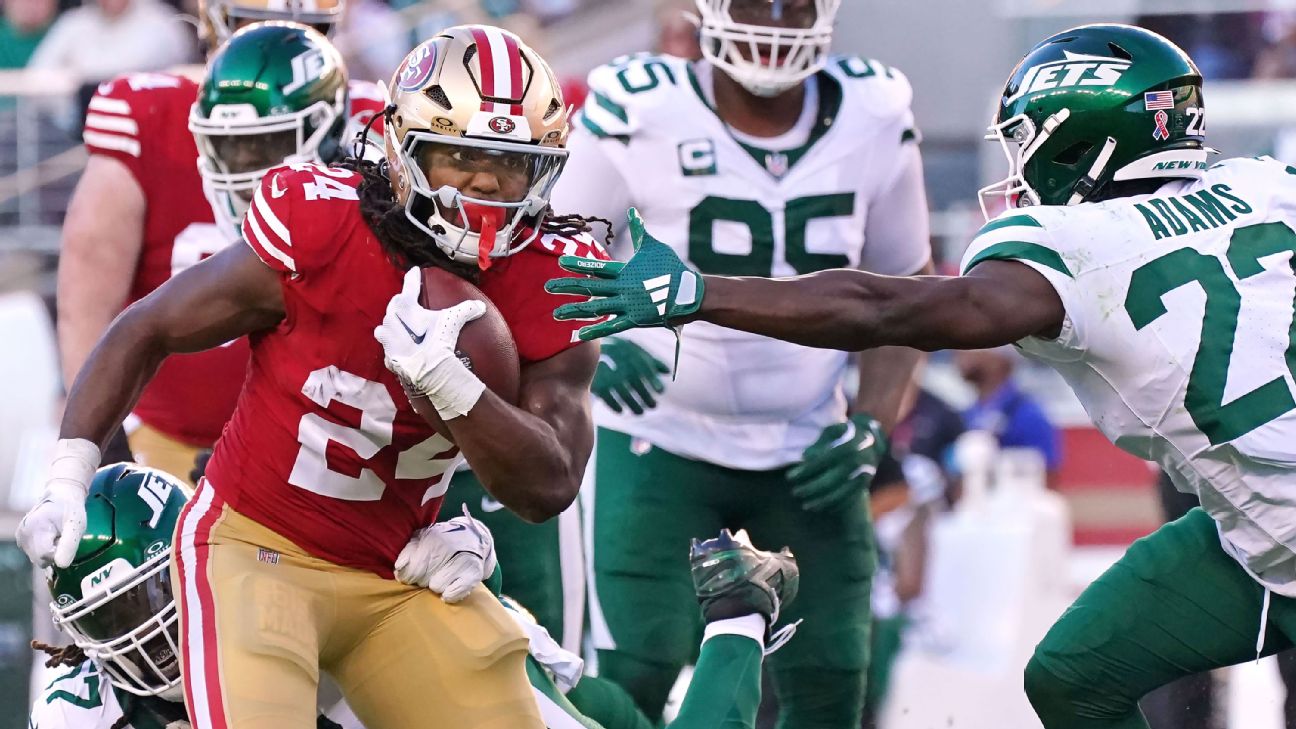 Eye-popping advanced stat: Without McCaffrey, receiver Deebo Samuel Sr. returned to his wide back role, getting some carries in addition to Mason. His 2-yard touchdown run in the second quarter was the 20th rushing score of his career. That is twice as many as any other player who was primarily a receiver in every season of his career -- with Jerry Rice and Tavon Austin each posting 10. -- Nick Wagoner