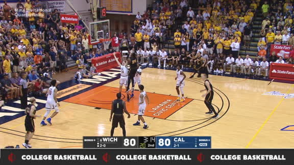Through a string of turnovers, Wichita State went on a 14-3 run that cut Cal's lead to seven and kept hounding and kept scoring as the fans inside tiny Lahaina Civic Center roared. The Shockers tied it at 76-all on Samajae Haynes-Jones' layup with just over 5 minutes left. The late 8-0 run put them up 86-80 -- and on to the semifinals.