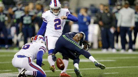 Anderson's crew chose not to flag Seahawks cornerback Richard Sherman for unnecessary roughness as he attempted to block Bills kicker Dan Carpenter's field goal attempt at the end of the first half. Sherman was penalized for being offside -- and was determined to be unabated to the kicker -- but the play was not stopped in time to prevent Sherman from getting a piece of the kick and crashing recklessly into Carpenter's legs.