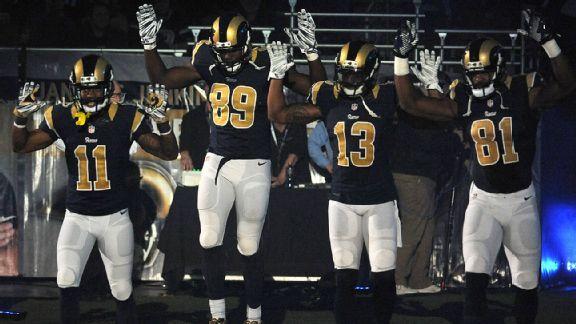 The players had used the team's pregame introductions to offer a show of support for nearby Ferguson.As the Rams' offense was introduced, tight end Jared Cook and receivers Kenny Britt, Stedman Bailey, Chris Givens and Tavon Austin stopped near the tunnel and raised their hands in a nod to the fatal shooting of black teenager Michael Brown by Ferguson police officer Darren Wilson on Aug. 9. Some witnesses said Brown had his hands up before being shot. Wilson, who is white, testified to the grand jury that Brown had hit him and reached for his gun.
