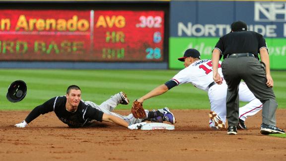 Arenado led off the second inning with a double to left field. His slide beat shortstop Andrelton Simmons' tag, a play that stood following a review that lasted 3 minutes, 48 seconds.