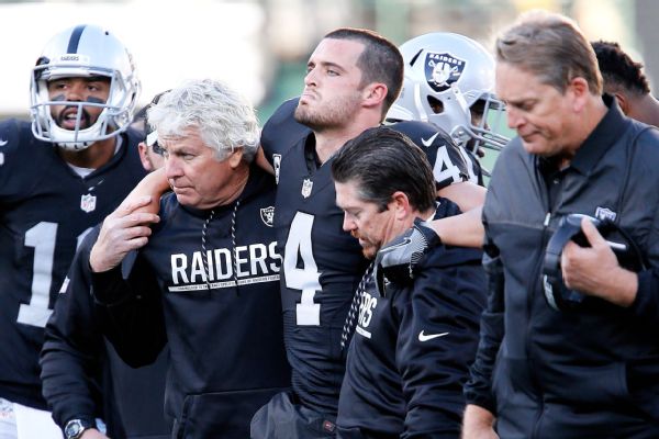 OAKLAND, Calif. -- Raiders quarterback Derek Carr suffered a broken right fibula while getting sacked early in the fourth quarter Saturday and is out indefinitely, Oakland coach Jack Del Rio said following his team's 33-25 win overIndianapolis.