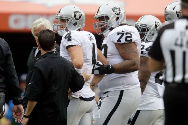 In Carr's absence, EJ Manuel threw for 159 yards with a 41-yard touchdown to Michael Crabtree while completing 13 of 26 passes. He was sacked three times.