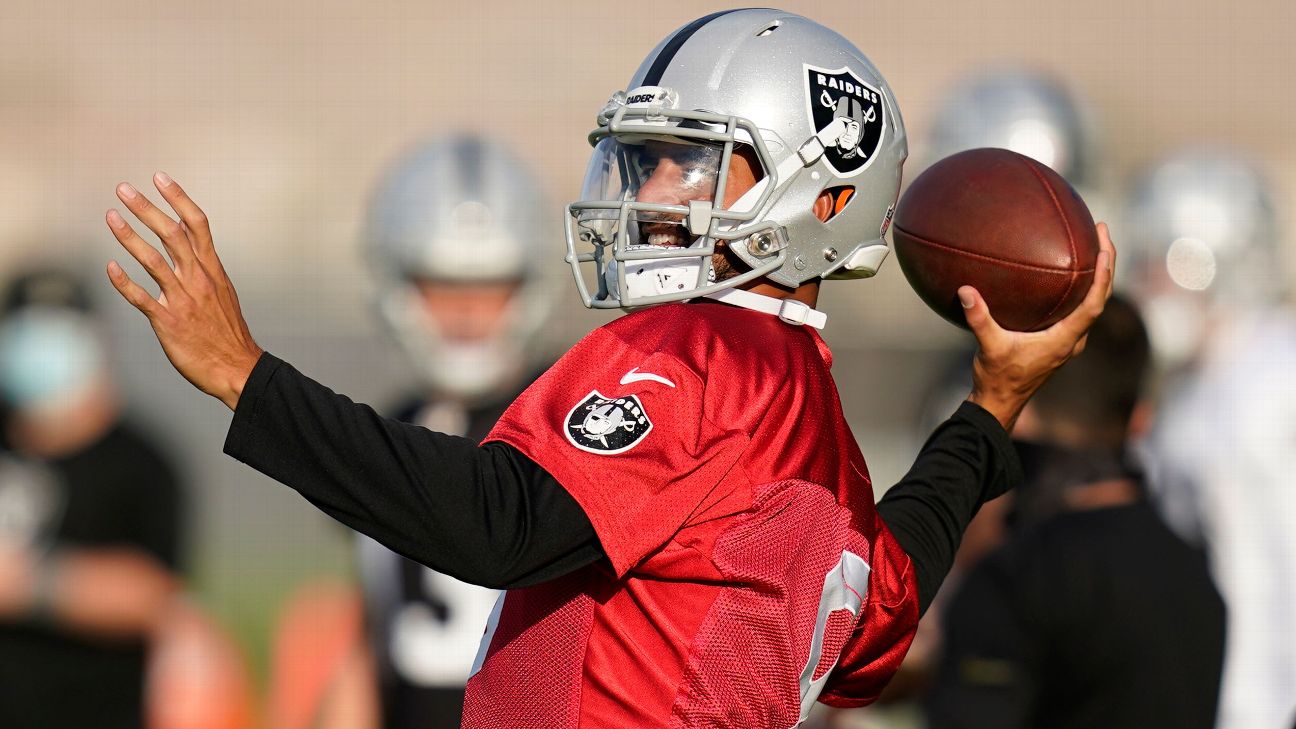 HENDERSON, Nev. -- While Derek Carr is firmly entrenched as the Las Vegas Raiders' starting quarterback, the guy signed to be his backup, Marcus Mariota, impressed coach Jon Gruden on Friday, the third practice of training camp in which players wore helmets.