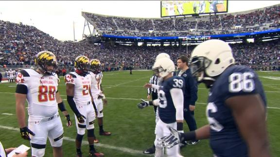 Maryland and Penn State also got into a brief scuffle before the coin toss. Wideout Stefon Diggs -- one of the Maryland team captains who refused a handshake, alongside tight end P.J. Gallo and safety Sean Davis -- was flagged 15 yards for unsportsmanlike conduct.