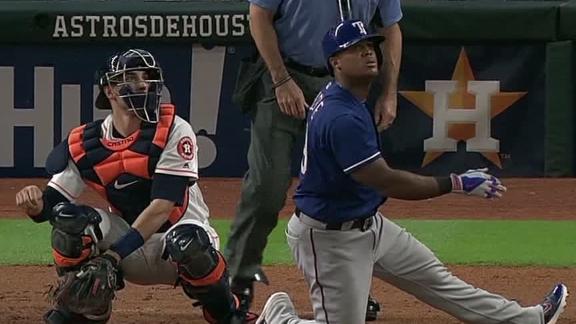 The Rangers slugger dropped down to get to Brad Peacock's pitch and crushed his 30th home run of the season from a kneel Tuesday night, giving Texas a 1-0 lead over the Houston Astros in the second inning. The Rangers went on to win 3-2.