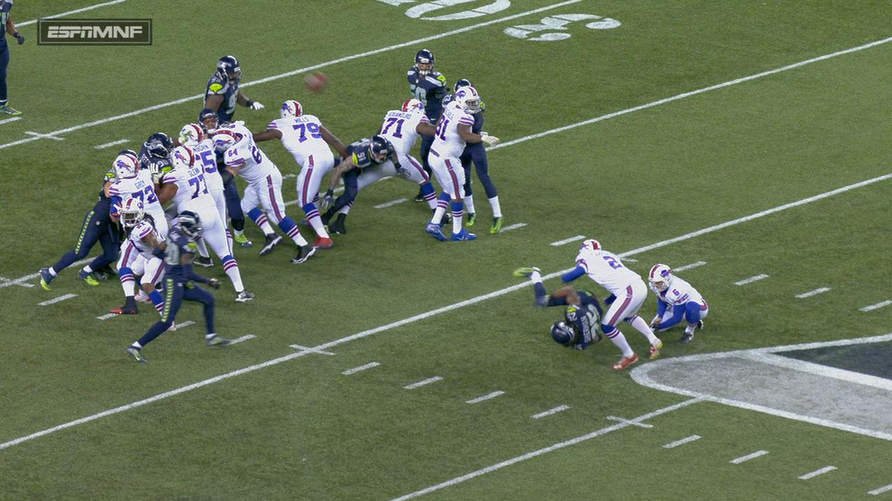 Bills trainers ran onto the field to tend to Carpenter, who remained on the ground after being hit by Sherman. Because trainers entered the field of play, Carpenter was required to exit the game, leaving the Bills without a kicker for the end-of-half attempt.