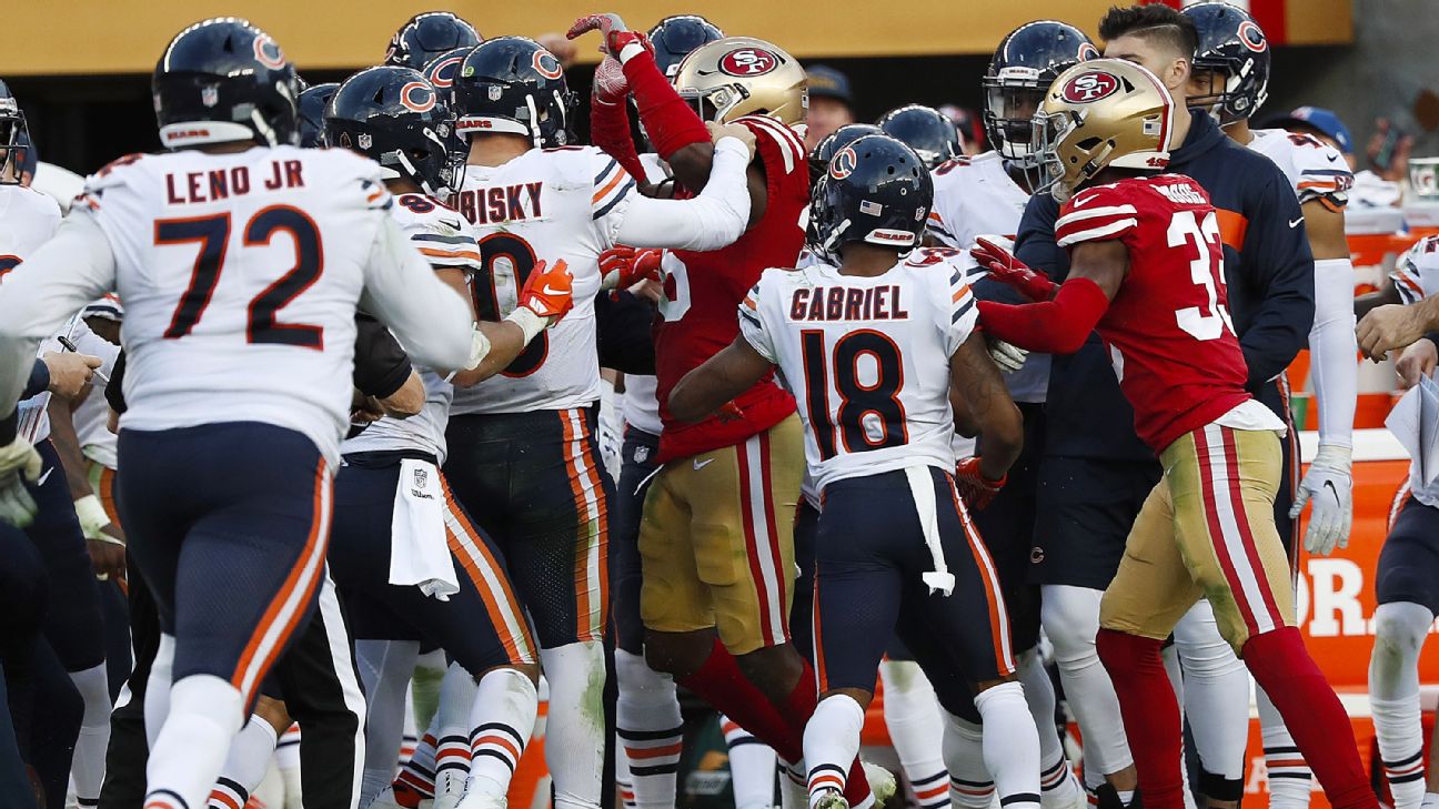 As multiple Bears rushed to stick up for Trubisky, other Niners entered the fray, setting off a fight that included multiple shoving matches and a flurry of punches. Bears receiver Anthony Miller immediately hit Harris, drawing another flag for unnecessary roughness.