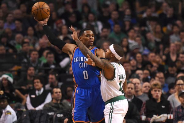 The timing also doesn't line up. Westbrook concluded his pregame routine with the walk-off shot at roughly 4:02 p.m. local time. Irving didn't hit his game winner until right at 4:15. Westbrook was asked if he watched any of the Cavs-Warriors game, and noted that he was on the court warming up during a large portion of it.