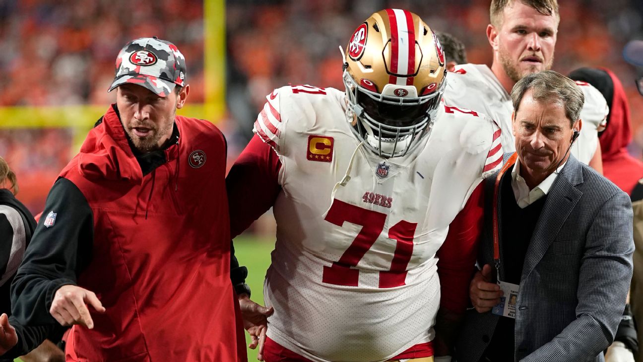 DENVER -- The San Francisco 49ers will be without two more key starters for at least the next month because of injuries left tackle Trent Williams and linebacker Azeez Al-Shaair suffered in Sunday night's loss to the Denver Broncos.