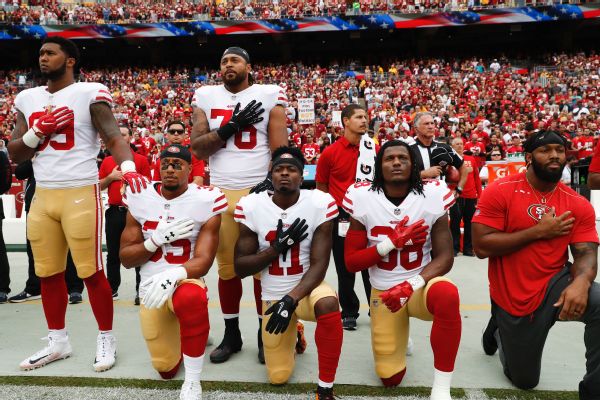LANDOVER, Md. -- After more than 20 San Francisco 49ersplayers knelt during the national anthem in each of the past two weeks, the team took a different approach before Sunday's game against the Washington Redskins.