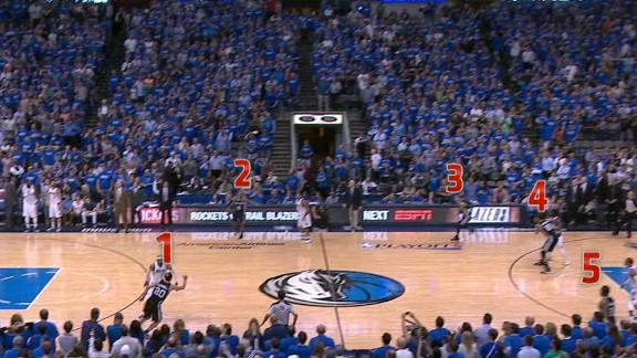 With the Spurs trailing 113-111 with 1.3 seconds left in the fourth quarter -- needing to go the length of the floor to score with no timeouts left -- Boris Diaw took the ball out of bounds on the baseline. In front of Diaw, spread out on the court, were five more Spurs players -- Manu Ginobili, Patty Mills, Danny Green, Kawhi Leonard and Tim Duncan -- giving San Antonio, in essence, a 6-on-5 advantage for a potential game-winning play.