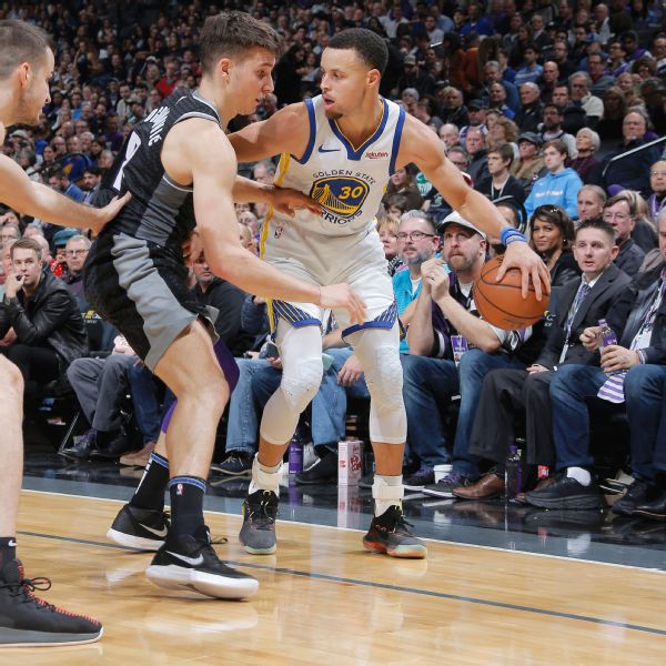 As the Warriors' starting lineup was being introduced, an old clip of an astronaut walking on the moon was played on the large video screens inside Golden 1 Center as "Zoom, Zoom, Zoom, We're Going to the Moon," by The Kiboomers blared on the speakers. Warriors players, including Curry, got a chuckle out of the trolling, as several looked up from the bench and laughed.