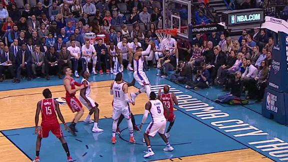 But as one streak continued, another ended, as the Houston Rocketswon 102-99 to snap the Oklahoma City Thunder's six-game winning streak. Westbrook finished with 27 points, 10 rebounds and 10 assists and sparked a 13-point comeback, but the Thunder fell short, with Westbrook and Anthony Morrow both airballing potential go-ahead 3-pointers in the final 30 seconds.
