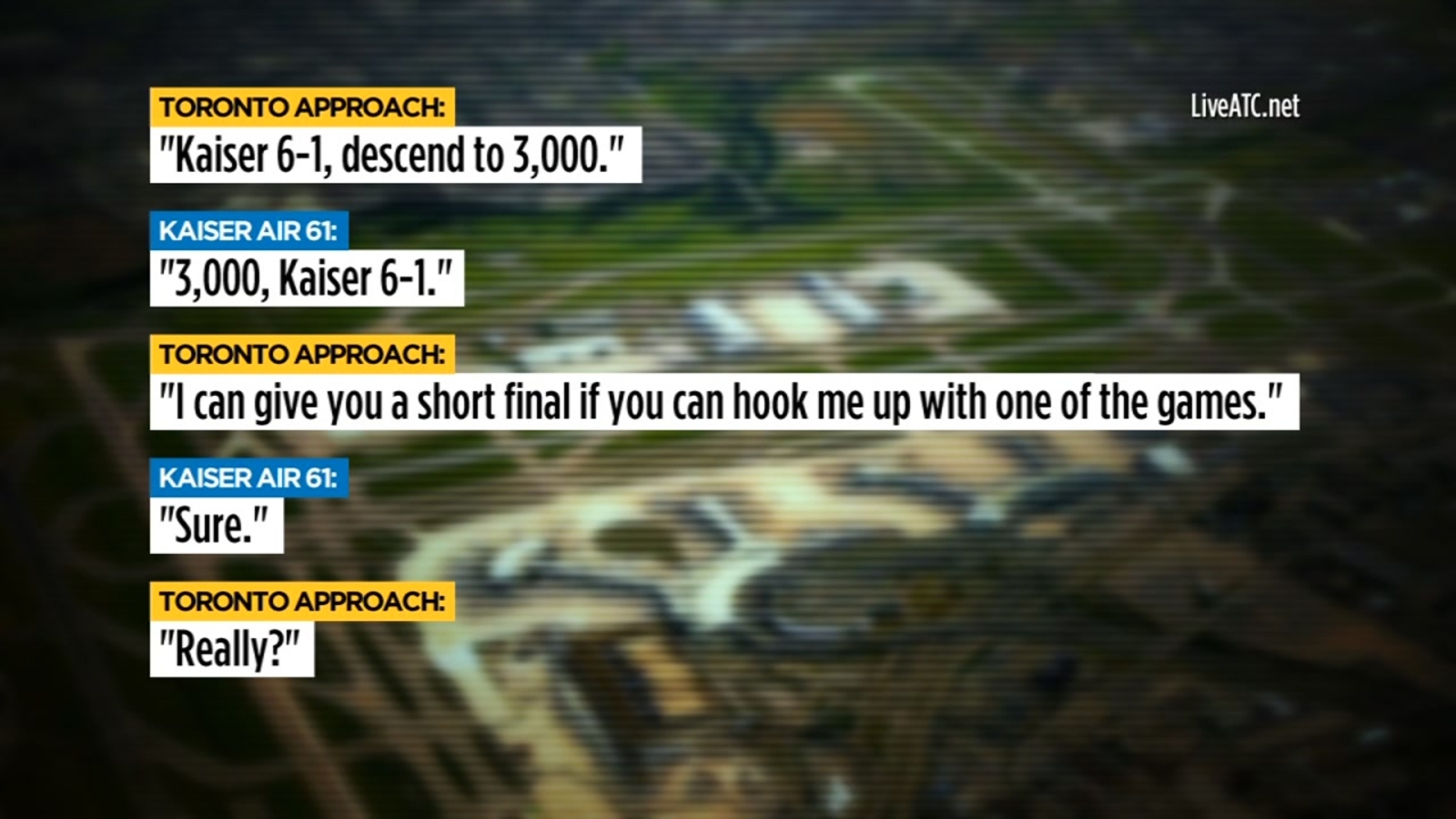 TORONTO (KGO) -- A Toronto air traffic controller had fun with one of the Warriors team jet pilots as they made their descent.