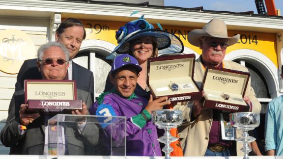 The chestnut colt made his usual striking appearance with the four white socks on his feet and the white blaze on his face, markings known as "chrome." He boasts a six-race winning streak -- all coming in stakes races -- since Espinoza became his regular rider.
