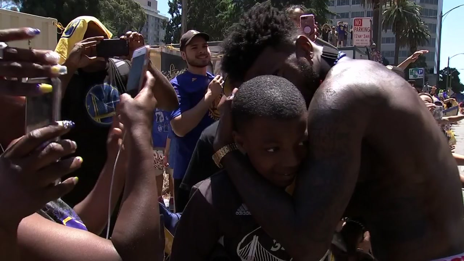 OAKLAND, Calif. (KGO) -- Golden State Warriors fans were treated to up close and personal appearances from their favorite players during the parade in Oakland. The crowd was going wild as Jordan Bell ran along the parade route, giving Warriors fans high-fives. He even gave one young fan a hug!