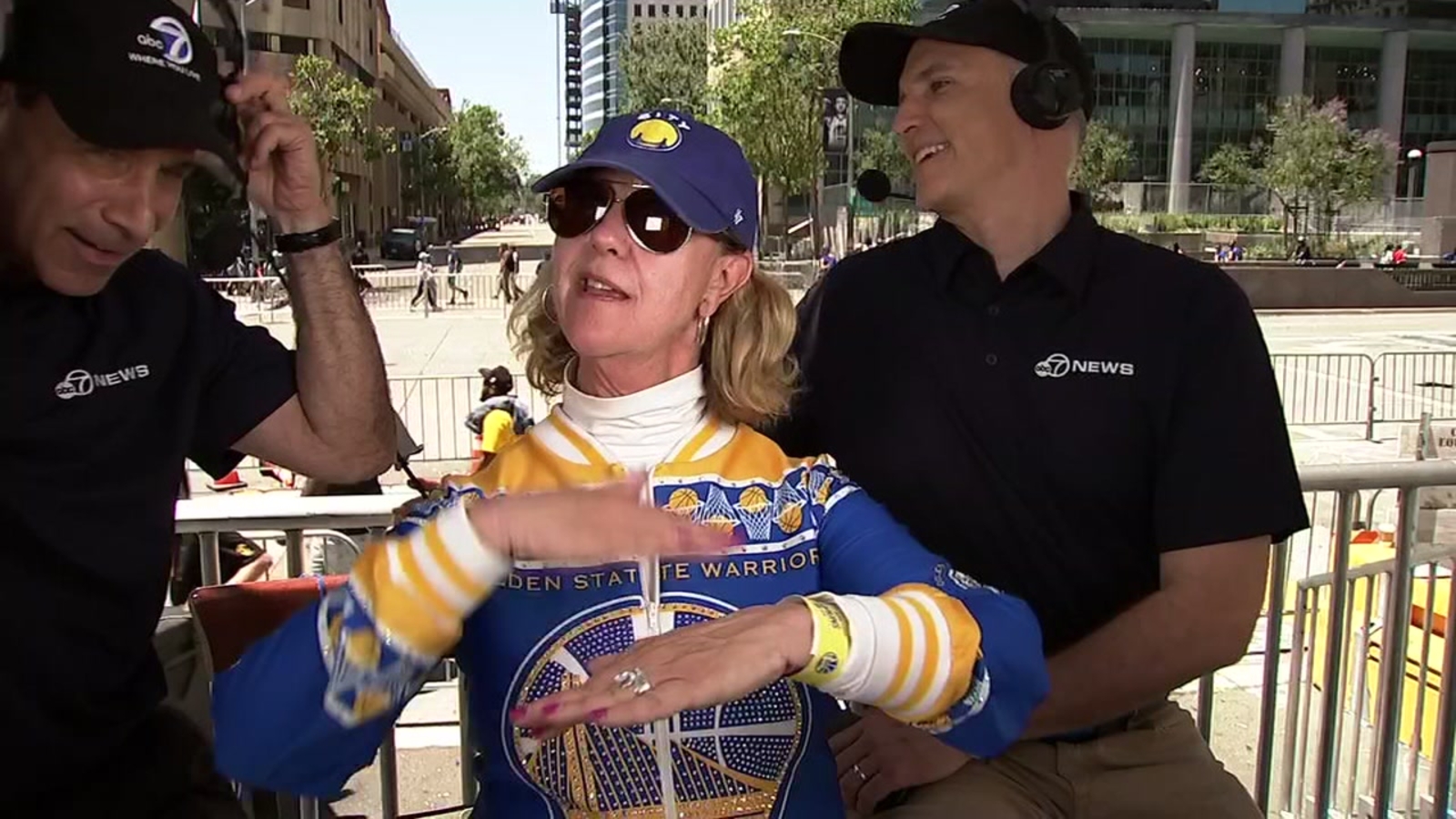 OAKLAND, Calif. (KGO) -- Dance cam mom Robin Schreiber made a surprise appearance during ABC7 coverage of the Warriors parade -- she even busted a move!