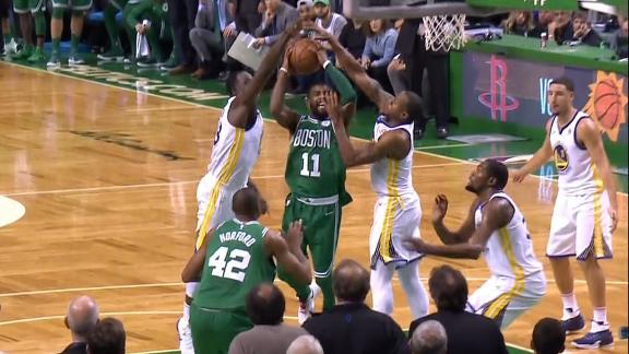 With 3:55 left, Irving brought the ball up the court with Klay Thompson defending. He drove hard to the left, initiating contact. Thompson kept his hands up to refrain from reaching, but he was assessed a personal foul. Stephen Curry, Andre Iguodala and Kevin Durant flung their arms in the air in bewilderment. Irving nailed both free throws, giving the Celtics a two-point lead.
