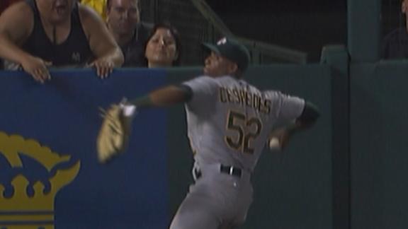 Trout's catch over the wall in center field robbed Cespedes of a home run to end the first.