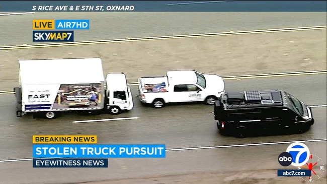The driver continued and made its way onto the southbound lanes of the 101 Freeway near Newbury Park where the suspect hit the corner of another box truck, leaving it with a dangling front bumper. They continued driving, and, near the Fillmore exit, the suspect in the stolen box truck rear-ended the driver of the second box truck.