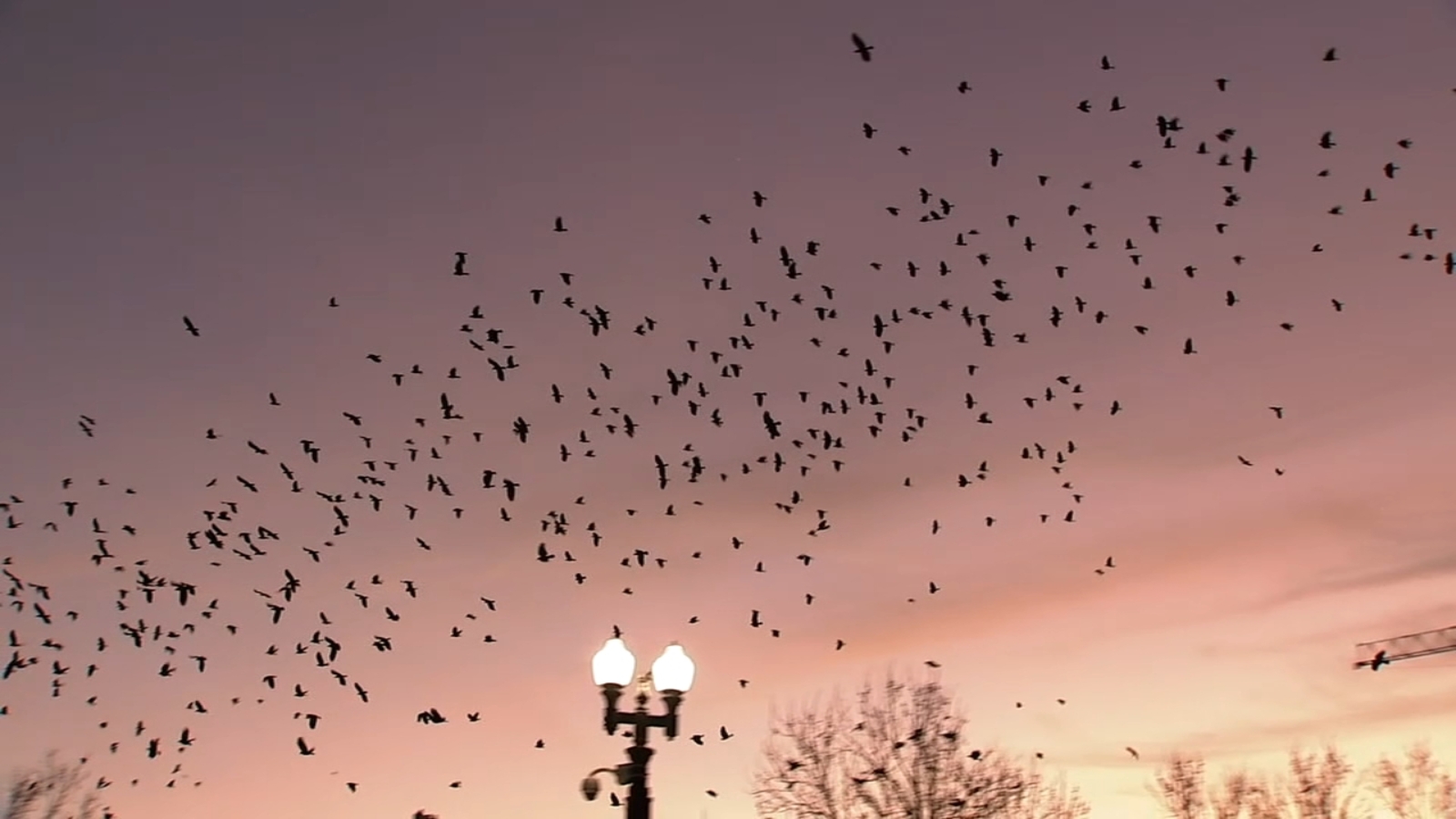 At dusk on Tuesday, the large group of crows could've been mistaken for a scene straight out of a movie.