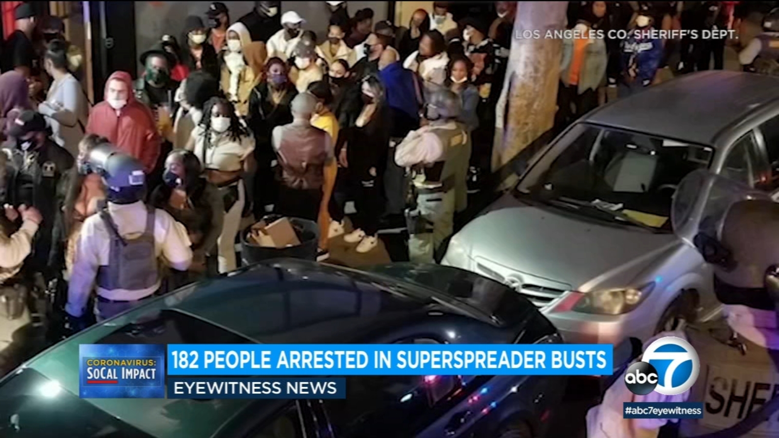 LOS ANGELES -- The Los Angeles County Sheriff's Department says 182 adults were arrested Saturday during a crackdown on underground "super-spreader" parties.