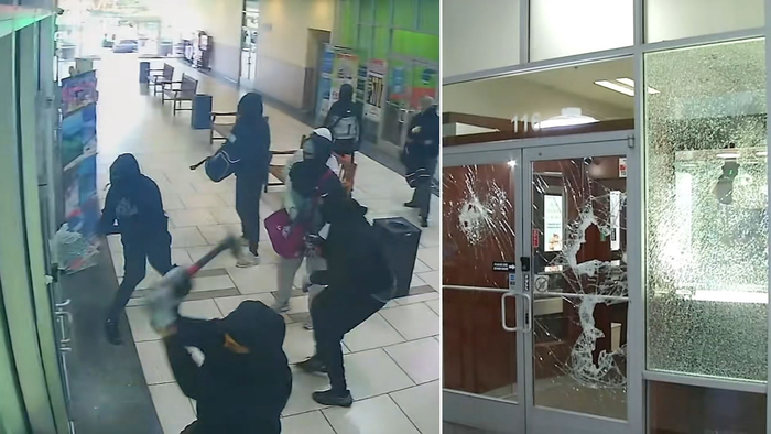 Surveillance video from Wednesday afternoon captures a group of masked suspects smashing into the front of Fine Jewelry in Milpitas, but within seconds, the suspects flee after the owner fires a shot.