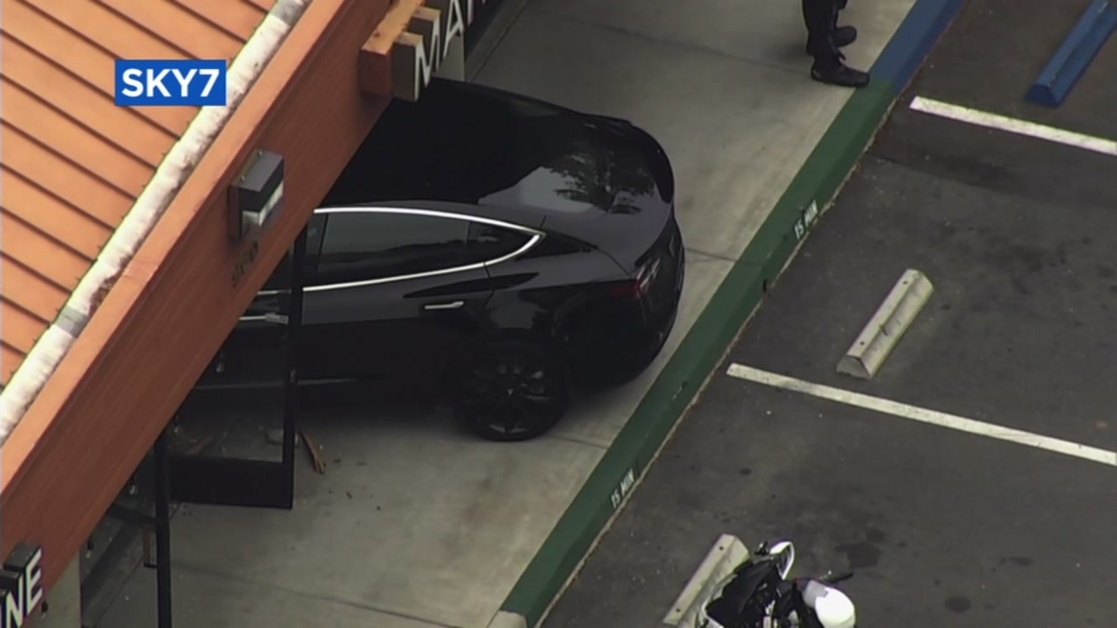LAFAYETTE, Calif. (KGO) -- A Tesla smashed through the front of the Marshall Steel Cleaners laundry service in Lafayette on Wednesday morning.