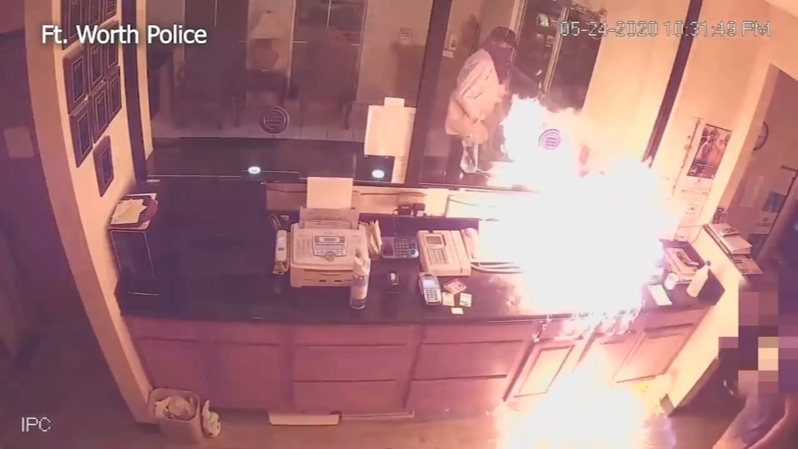 FORT WORTH, Texas -- Authorities in north Texas are searching for a man seen on surveillance video setting fire to a hotel clerk.