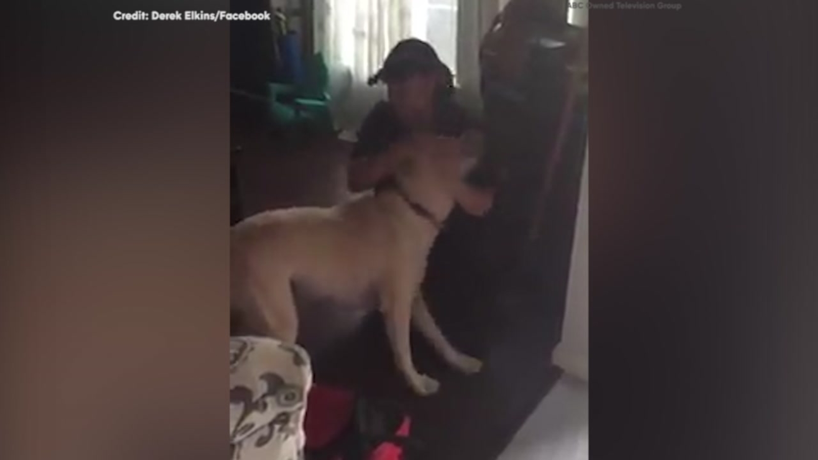Derek posted the video to Facebook with the caption: "My wife Karen Elkins just got home after working 164 hours straight on the ambulance due to Hurricane Harvey. Our lab Peck was just a little happy to see his momma."