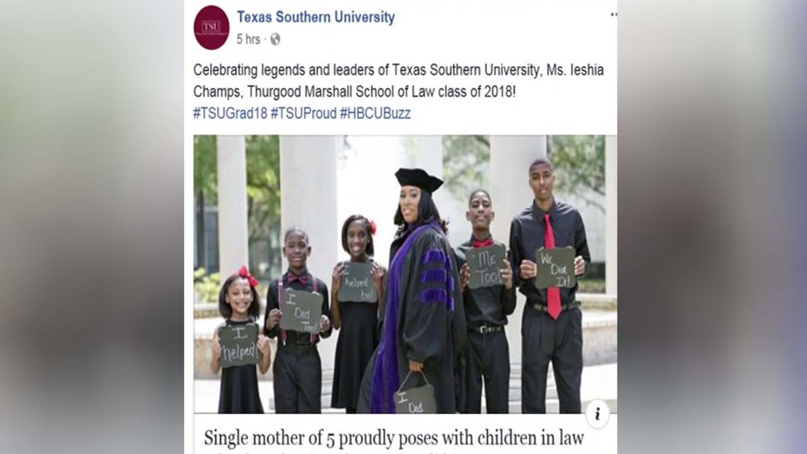 HOUSTON -- A single mom of five who will graduate from Texas Southern University's Thurgood Marshall School of Law is the perfect example of why you should never give up.