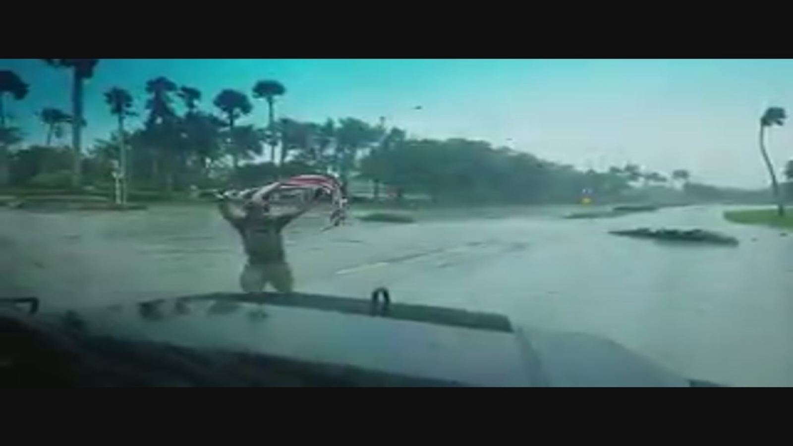 The officer is seen retrieving the flag from a deserted highway and holding it up high - still intact - despite the windy, wet conditions.