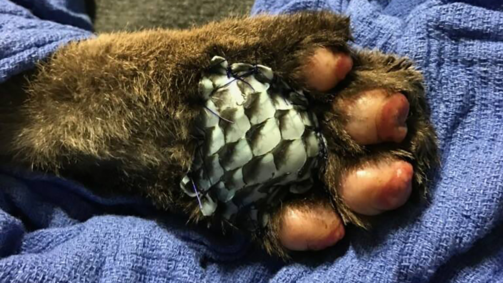 The bandaging technique, which has also been used on human burn patients, protects the burn and provides collagen to help facilitate the healing process. The animal will likely chew the fishy bandage off at some point.