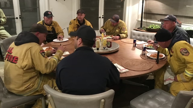 The flames were dangerously close to Lowe's house in Montecito. A group of San Jose firefighters protected his multi-million dollar home. They were exhausted from the firefight, but we're thrilled when Lowe invited them to his house for dinner.