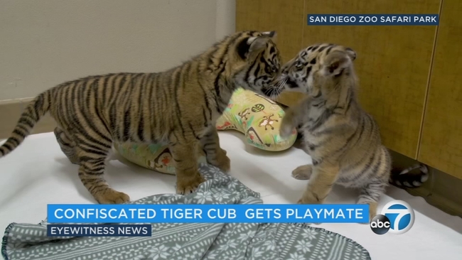 SAN DIEGO -- A little tiger cub confiscated from an alleged smuggler's car at the California-Mexico border last month now has a new friend to play with.