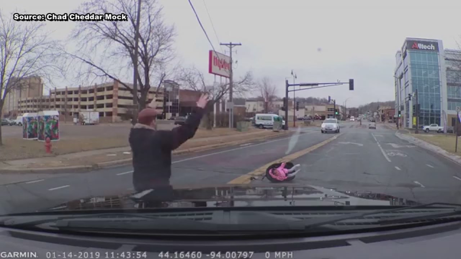 Mock, who was driving behind the sedan stops his car and runs to the child's side. Waiving his arms in the air, he stops an oncoming van from getting too close to the child.