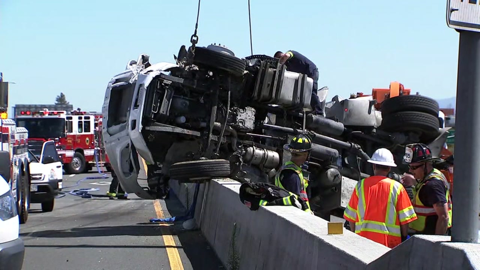 After losing control the truck veered left across all lanes and hit a white sedan in lane one, then hit the center median wall and overturned, landing mostly on southbound lanes.
