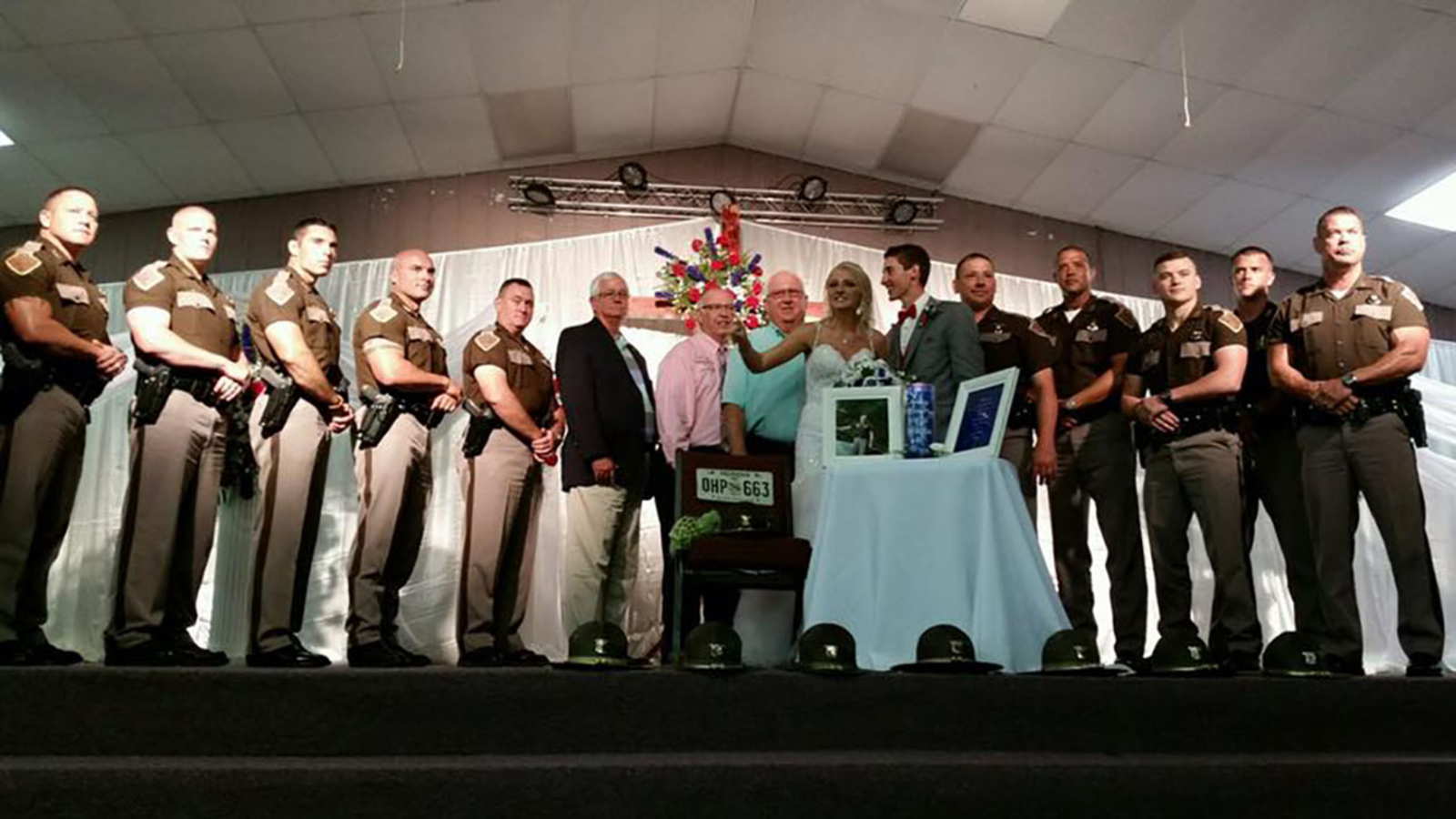 In a show of support for one of their fallen comrades, members of the Oklahoma Highway Patrol (OHP) attended the wedding of Kendra McClendon, daughter of Trooper Bill McClendon, in uniform.